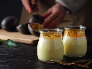Ponha as folhas de gelatina de molho em água fria. Abra os maracujás ao meio e retire a polpa com uma colher para dentro de uma tacinha.